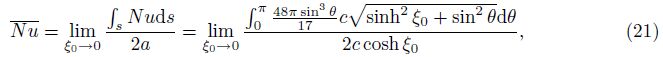 Figure 5 shows the variation of Nu with the axis ratio. The two limiting values,namely,as the axis ratio tends to zero and as the axis ratio tends to 1,are $\frac{9{{\pi }^{2}}}{17}$ and $\frac{43200{{\left( {{\pi }^{2}}-8 \right)}^{2}}}{{{\left( 2+\pi \right)}^{2}}\left( -328504+21775{{\pi }^{2}}+18900\zeta \left( 3 \right)+66560\ln 4 \right)}$ ,respectively. These two results are usually reported in the literature as the approximate values of 5.225 and 4.088,respectively. The first,$\frac{9{{\pi }^{2}}}{17}$ ,was obtained by Tao[10] as a limiting value for a degenerate full ellipse. Of course,a degenerate full ellipse is identical to a degenerate semi-ellipse. We obtain the same value $\frac{9{{\pi }^{2}}}{17}$ by observing that as b/a → 0 (or equivalently ξ0 → 0),the curved top wall coincides with the bottom flat wall. One can then average the local Nusselt number given by Eq. (18) over the curved surface and then take the limit as ξ0 → 0,i.e.,