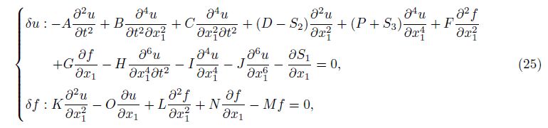 Considering both the kinetic energy and the potential energy in the Hamilton principle and performing the integration by part operations yield two final differential equations as follows: