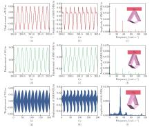 Displacement of the LO (left), displacement of the SMO-NES (middle), and spectrum of the SMO-NES (right) for (a)–(c) θA0=−30π/180, kC=0.122 N/(rad⋅m), G=0.514 5 N; (d)–(f) θA0=−40π/180, kC=0.296 N/(rad⋅m), G=1.366 N, F0=2 N, and ω=27.27 rad/s; (g)–(i) θA0=−70π/180, kC=1.387 N/(rad⋅m), G=10.21 N, F0=2 N, and ω=27.31 rad/s (color online)"