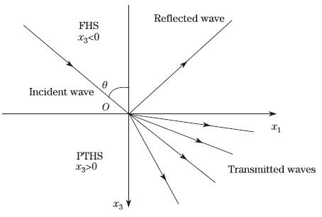 3.1 Amplitude ratiosConsider a PTHS,having 6mm symmetry,loaded with the FHS. The PTHS occupies the region x3 ≥ 0,and the FHS occupies the region x3 ≤ 0,as shown in Fig. 1. A plane wave, making an angle θ with the x3-axis,becomes incident at the interface. This wave results in one reflected wave in the FHS and four transmitted modes in the PTHS. The transmitted wave modes are represented by qP,qS,qT,and the fourth mode PE1 corresponds to the electric potential wave mode. The formal solutions for the mechanical displacements,the temperature, the electric potential,the stress components,and the electric displacements in a PTHS are