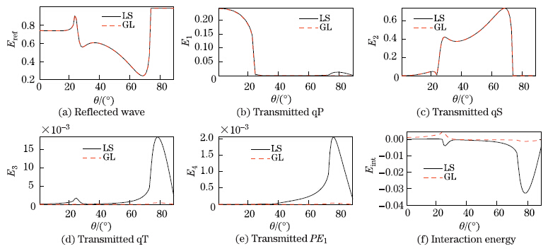 By solving this system,we obtain the values of transmitted and reflected amplitude ratios. Then,using these values of amplitude ratios and equations from (23)-(28),we can calculate the energy ratios for different waves.