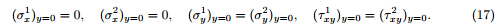 ,respectively. It can also be determined that which one,Zone 1 or Zone 2,is the tensile zone by the value of the stress component σx.The stress components also satisfy the secondary boundary conditions at x = 0,shown as follows: