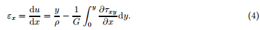 where τxy is the shear stress,G is the shear modulus,and γxy is the shear strain. where ρ is the curvature of the deformed beam.The absolute elongation of the layer AB is given as