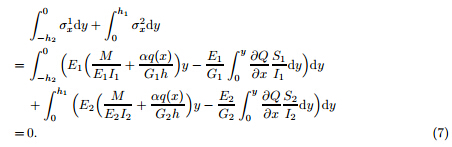 According to the assumption proposed by Yao and Ye[6] ,the stress σx at the neutral surface y = 0 is zero. The stresses σx,σy,and τxy should maintain continuous. The equations are obtained as follows: