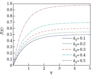 | Fig. 7 Variations of f(η) with k2 at R = Pr = M = Ec = 1 and fw = 0 |