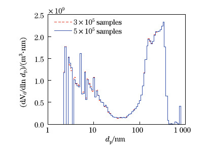 One big advantage of the MC over the QMOM is that the MC can provide the PSD. Figure~4 shows the PSD at the end of the trajectory (where $d_\mathrm p$ is the particle diameter). The results from 300 and 500 thousand samples are compared to check the stochastic convergence. The PSD shows complex multi-modal distribution. The peaks in the PSD are closely related to the nucleation rate curve in Fig. 2. The rightmost peak in the PSD corresponds to the leftmost spiky peak in the nucleation rate curve,where the nucleated particles have the longest residence time to grow into the largest ones. Particles in the big peak in the PSD from 100 nm to 400 nm are generated in the nucleation burst during 0.01 s to 0.018 s in Fig. 2. The big trough in the PSD corresponds to the dip in the nucleation rate around 0.02 s. Particles under a few tens of nanometer in the PSD are generated in a narrow time period after 0.02 s. The relatively broad distribution of these nanometer-sized particles is due to the fast condensation growth rate for small particles. As this example PSD shows,the combination of nucleation and condensation can render very complicate distribution. The distribution may even be discontinuous when nucleation ceases to generate particles for an extensive period of time and the particles still grow due to condensation.