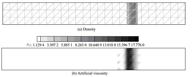 | Fig. 10 Density and artificial viscosity contours for two-dimensional stationary shock of Ma=1.4 (P4) |