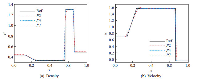 The computation is stopped at t=0.13. Density and velocity profiles are given in Fig. 13, in which the reference denotes the exact solution to this problem. It can be seen that results by all the approximation orders agree well with the exact solution, and the spurious oscillations are well suppressed. The slight overshooting at the tail of the expansion wave is attributed to insufficient viscosity of the model for contact discontinuity at the start-up phase. We further note that this model may encounter stability issues for problems with strong contact discontinuities. The superior accuracy of higher order methods over low ones can also be observed even for this shock-dominated case. Note that although this dilation-based shock sensor cannot trigger any artificial viscosity for contact discontinuity, as can be seen in Fig. 14, the results show little spurious oscillations around that region.