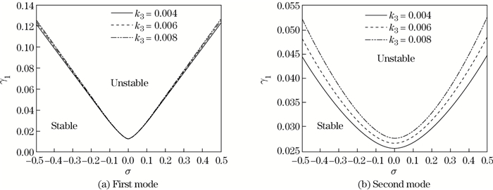 The dotted line denotes k3 = 0.006, the dot dashed line denotes k3 = 0.008, and the solid line denotes k3 = 0.004. When σ is nearby zero, it is illustrated that larger instability region is obtained when the beam stiffness increases. But the trend is reversed after arbitrary two boundaries cross σ. This phenomenon is the same as the effects of the beam stiffness.
