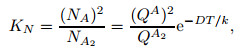 where QA and QA2 are atomic and molecular partition functions, respectively, and T stands for the temperature. D is the dissociation energy of one molecule A2 and also called the heat reaction of one molecule A2. As the temperature is greater than the vibrational characteristic temperature of molecules, the vibrational energy of the molecules will be excited completely. If the distance between molecules increases, the molecular potential energy tends to be a constant value called the dissociation energy of molecules. That is, the energy required for the dissociation of molecules is D. D/k is the dissociation characteristic temperature of A2 molecules. The dissociation characteristic temperatures of O2 and N2 molecules are 59 000 K and 113 200 K, respectively.