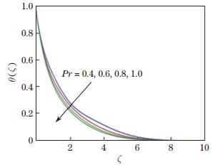 Figure 7 presents the behavior of θ (ζ) for Pr. It can be seen that, when Pr increases, the fluid temperature and thermal boundary layer thickness decay. Since the thermal diffusivity decreases when Pr increases, the fluid temperature decreases.