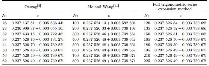 The most unstable eigenvalue c computed by our trigonometric series expansion method is listed in Table 5. Comparing the results with those of He and Wang[11] obtained by the Chebyshev collocation method and the finite difference method, it is found that the eigenvalue converges to the same value 0.243 260 44 + 0.002 270 66i.